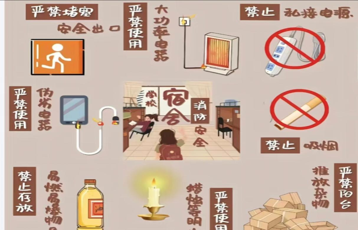 5.不占用、堵塞消防疏散通道:安全出口和疏散通道是“生命通道”。宿舍内物品摆放应避免堵塞门、窗,不得在走廊、过道上堆放杂物,确保消防疏散通道畅通无阻。